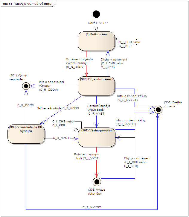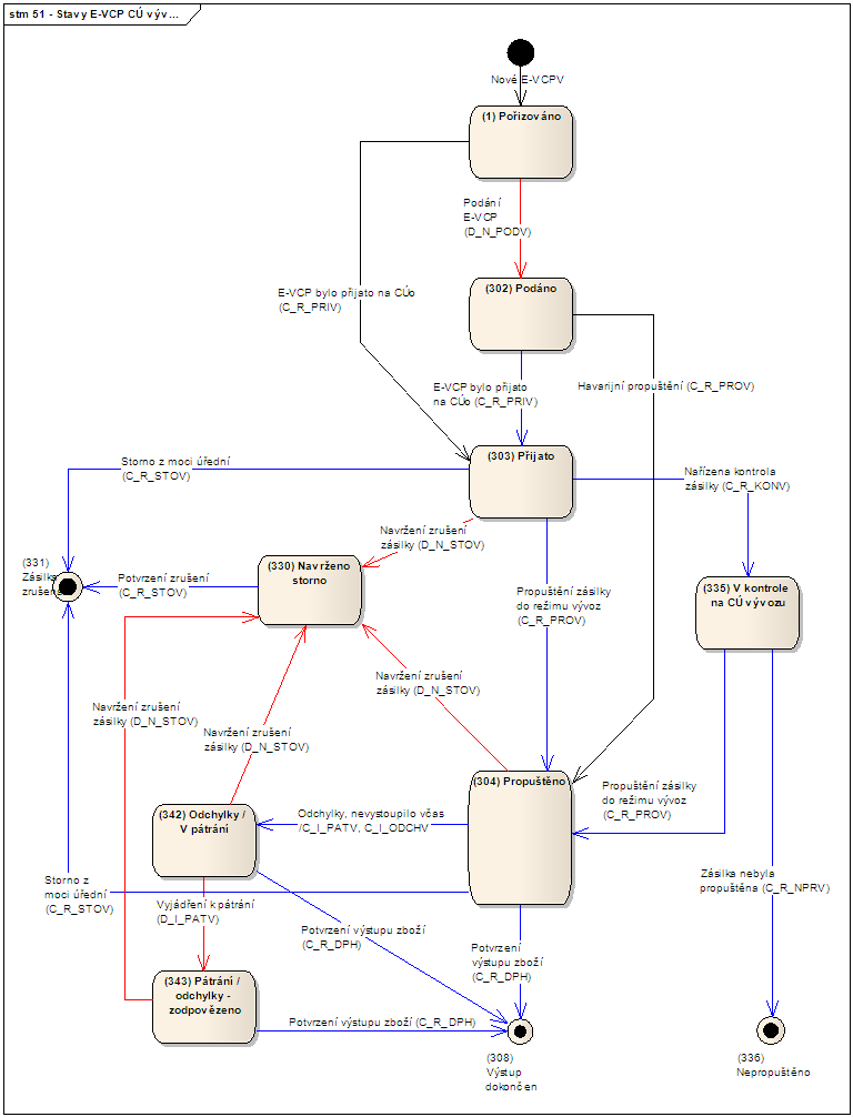 Důležitým rozdílem v porovnání s režimem tranzitu je skutečnost, že vývoz může hlavní povinný stornovat odesláním zprávy D_N_STOV i po propuštění. Viz. stavový diagram níže.