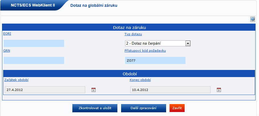Při podání E-TCP musí uživatel aplikace NWK jako uživatel záruky od 6. 4. 2005 uvádět přístupový kód při každém použití dané jistoty/záruky. Při vydání povolení používat jistotu CÚ záruky je přidělen primární přístupový kód, který majitele jistoty opravňuje pracovat dále s jistotou. Primární přístupový kód však nelze uvést při podávání E-TCP. K tomuto účelu slouží sekundární přístupové kódy, které umožňují uživateli jistotu použít.