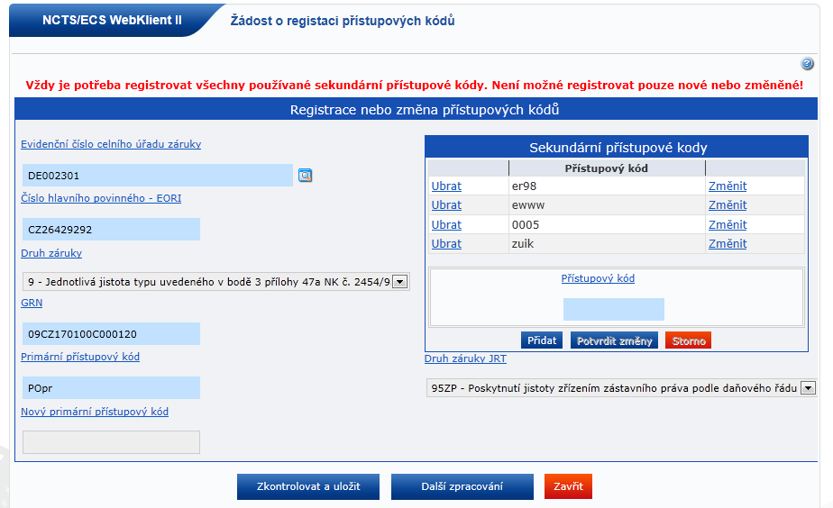Přestože uživatel aplikace NWK například přidává pouze jeden sekundární přístupový kód, musí uvést i všechny ostatní existující kódy, které chce nadále používat. Jinak to aplikace NWK vyhodnotí jako zrušení existujících sekundárních přístupových kódů. Tzn. vždy se musí zadat všechny aktuálně platné přístupové kódy.