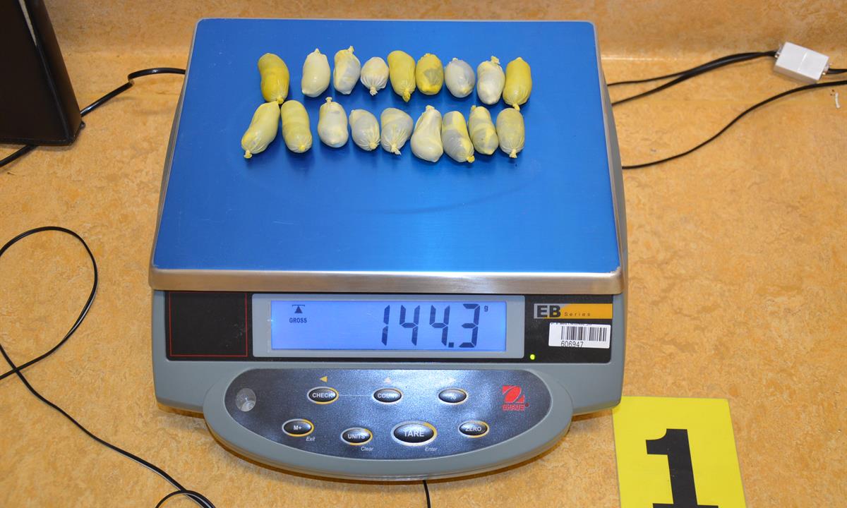 Postupně z těla pašeráka vyšlo všech 107 kontejnerků naplněných tuhou hmotou černé barvy. Chemická látka při provedení detekční zkoušky pozitivně reagovala jako opiát. Celková hmotnost všech kapslí včetně drogy je 856 gramů. Určení vlastní hmotnosti a druhu zajištěné drogy je předmětem další odborné expertízy. Podle zkušeností celníků se s největší pravděpodobností jedná o surové opium. Tento druh drogy není na českém trhu obvyklý a zřejmě byla určena k distribuci v jiné zemi.