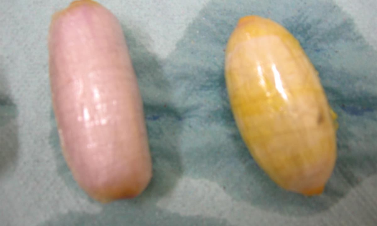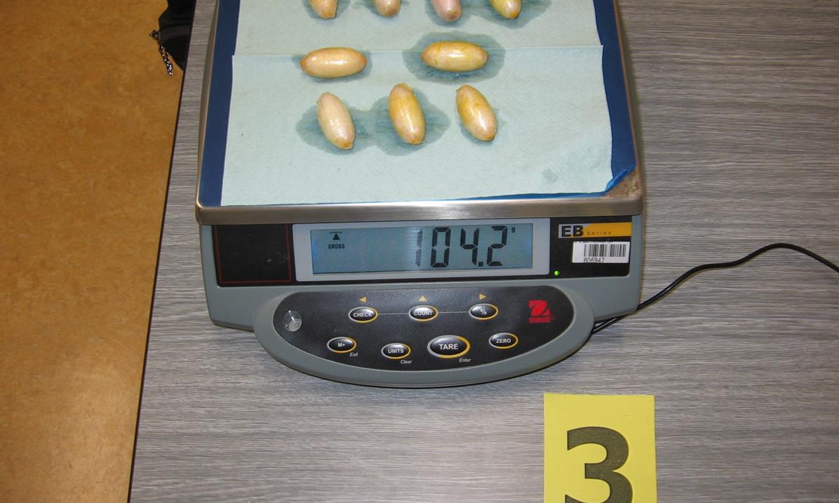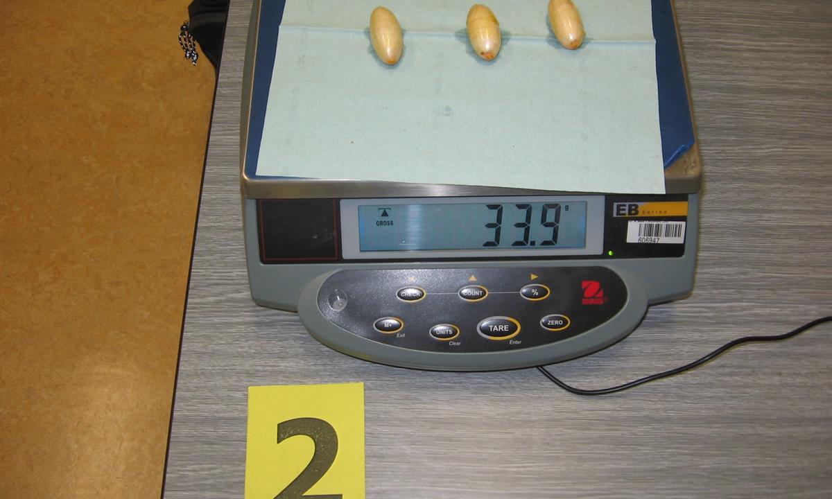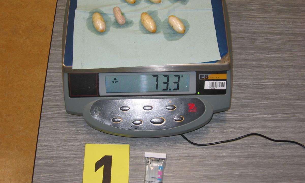 Postupně z těla pašeráka vyšlo všech 19 kontejnerků naplněných bílým práškem. Chemická látka při provedení detekční zkoušky pozitivně reagovala jako kokain. Celková hmotnost všech kapslí včetně drogy je 211,4 gramů. Určení vlastní hmotnosti a druhu zajištěné drogy je předmětem další odborné expertízy. Podle zkušeností celníků se s největší pravděpodobností jedná o velmi koncentrovaný kokain. Zda byla droga určena na český trh nebo k distribuci v jiné zemi, je předmětem dalšího šetření.