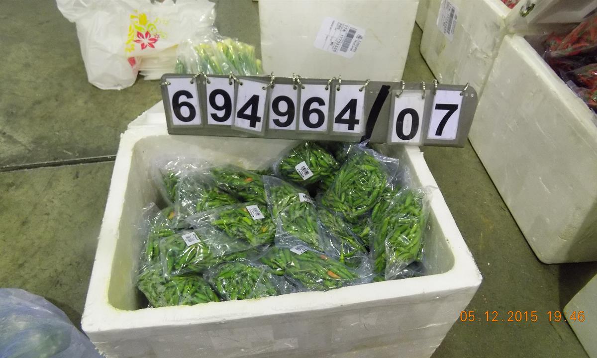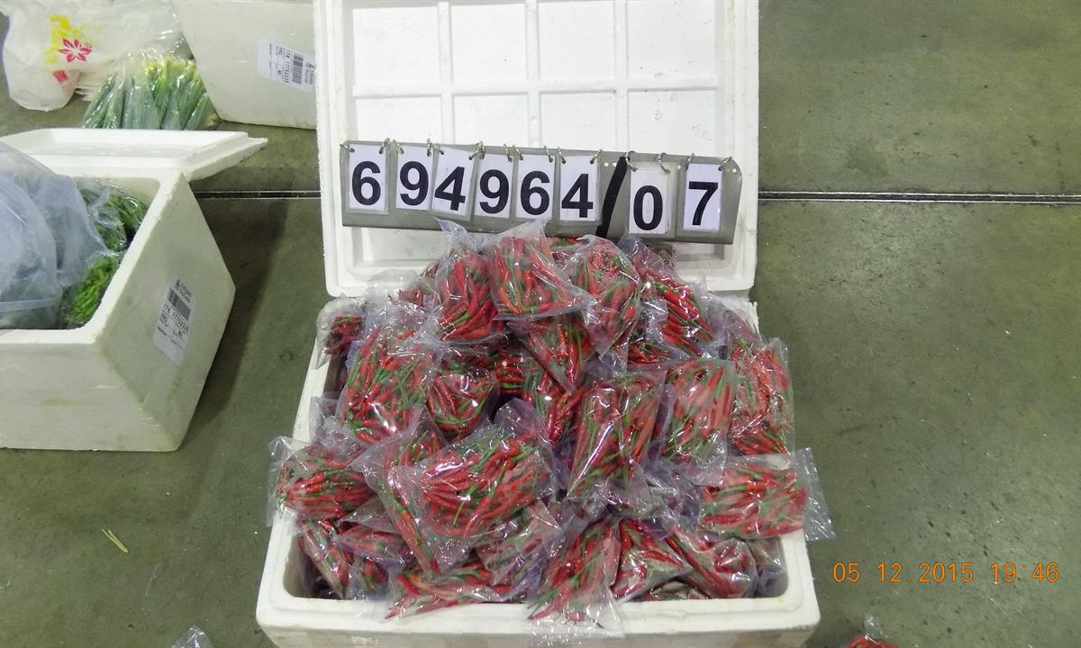 U zásilky bylo zjištěno, že deklarované údaje nesouhlasí s předloženým zbožím. Jednalo se především o rozdílné hmotnosti jednotlivých druhů čerstvé zeleniny a ovoce. Kontrolou bylo zjištěno, že se v zásilce nachází i nepřihlášené zboží. Jednalo se o 755 kg čerstvých chilli papriček. Potraviny byly v dovozních dokladech uvedeny u položky s nulovou sazbou cla.