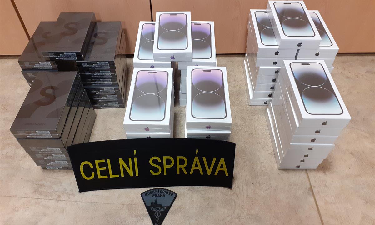 Padělky mobilních telefonů iPhone a Samsung zajistili pražští celníci při kontrole vozidla na 4,5 kilometru dálnice D1 ve směru na Prahu.
