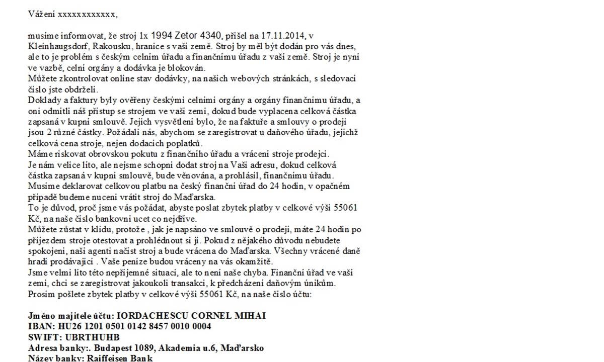 Obsahem e-mailových zpráv od „dodavatele zboží“ je vyrozumění o zadržení zboží úřady a nutností převést finanční prostředky na bankovní účet. Připojené doklady jsou opatřeny logy a razítky, které celní správa nepoužívá.