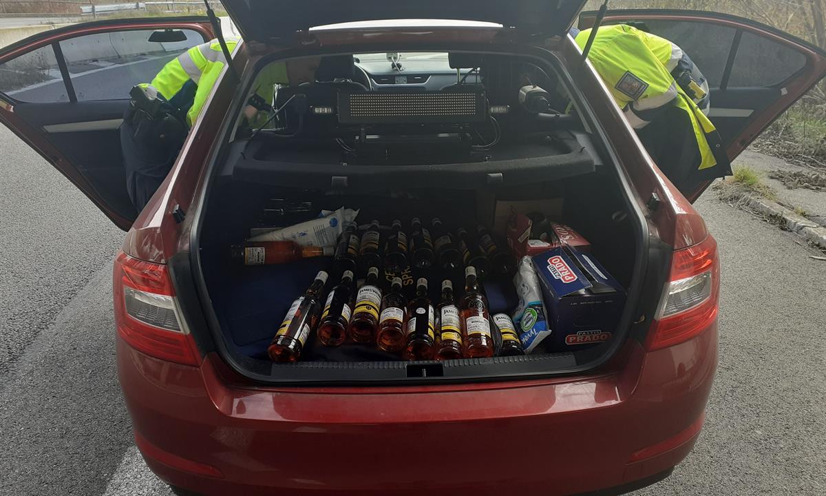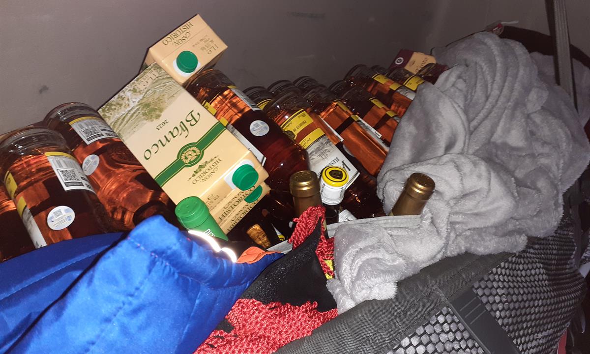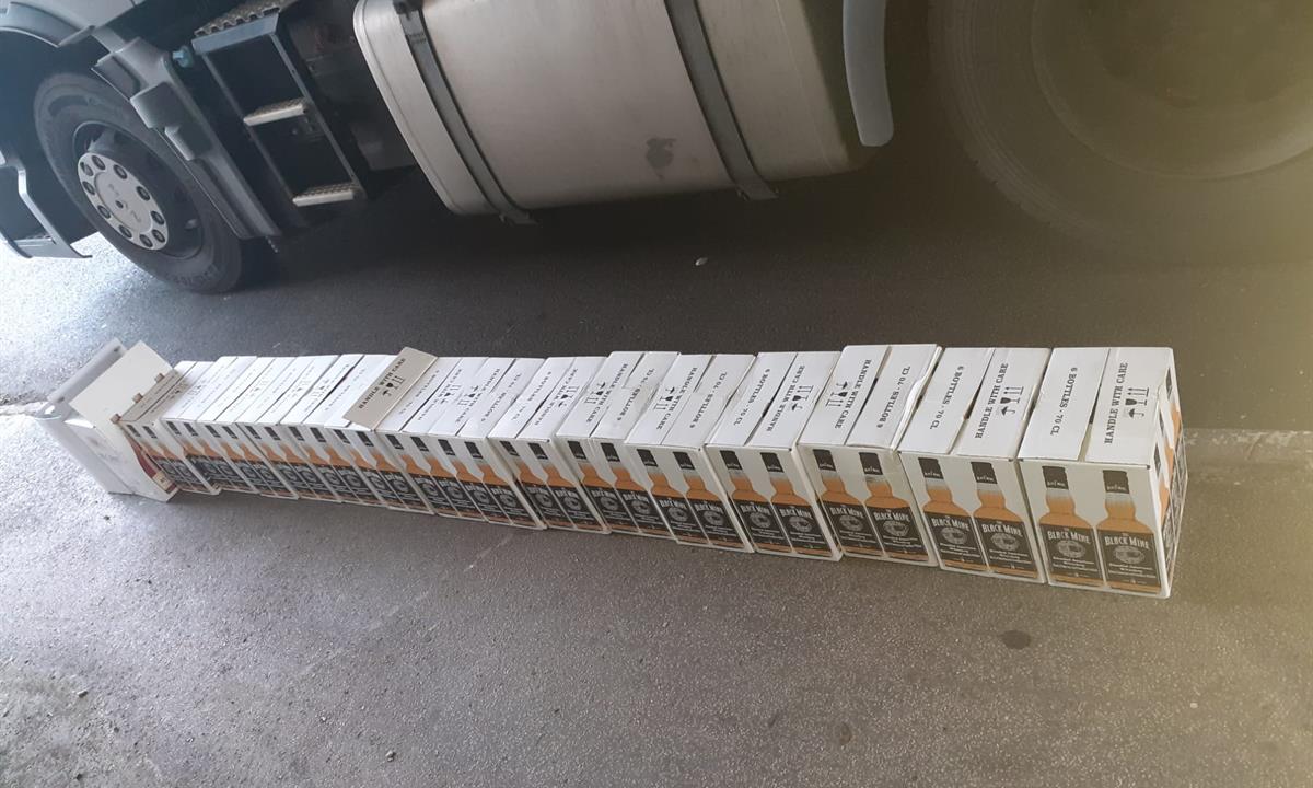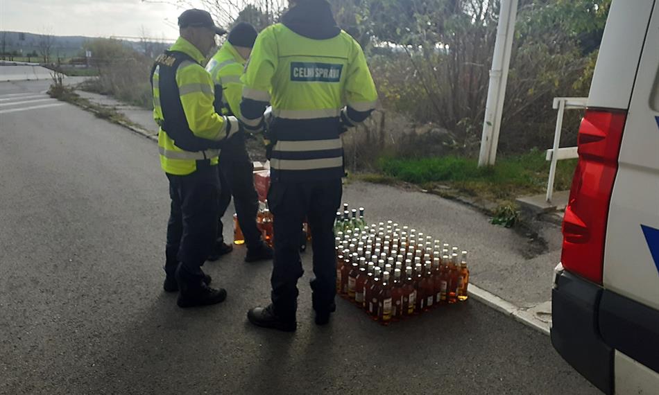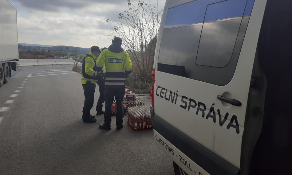 Po základním prověření totožnosti řidičů a vozidel v příslušných aplikacích celníci přistoupili ke kontrole přepravních dokladů a nákladu. Na otázku, zda nepřeváží nějaké zboží zatížené spotřební daní např. cigarety nebo alkohol, první z řidičů odpověděl, že nepije ani nekouří. Při prohlídce kabiny ale hlídka na horním lůžku našla 111 lahví lihovin. Muž uvedl, že alkohol veze pro rodinu, nebyl ovšem schopen předložit potřebné přepravní doklady. Únik na spotřební dani činil 12 031 korun.