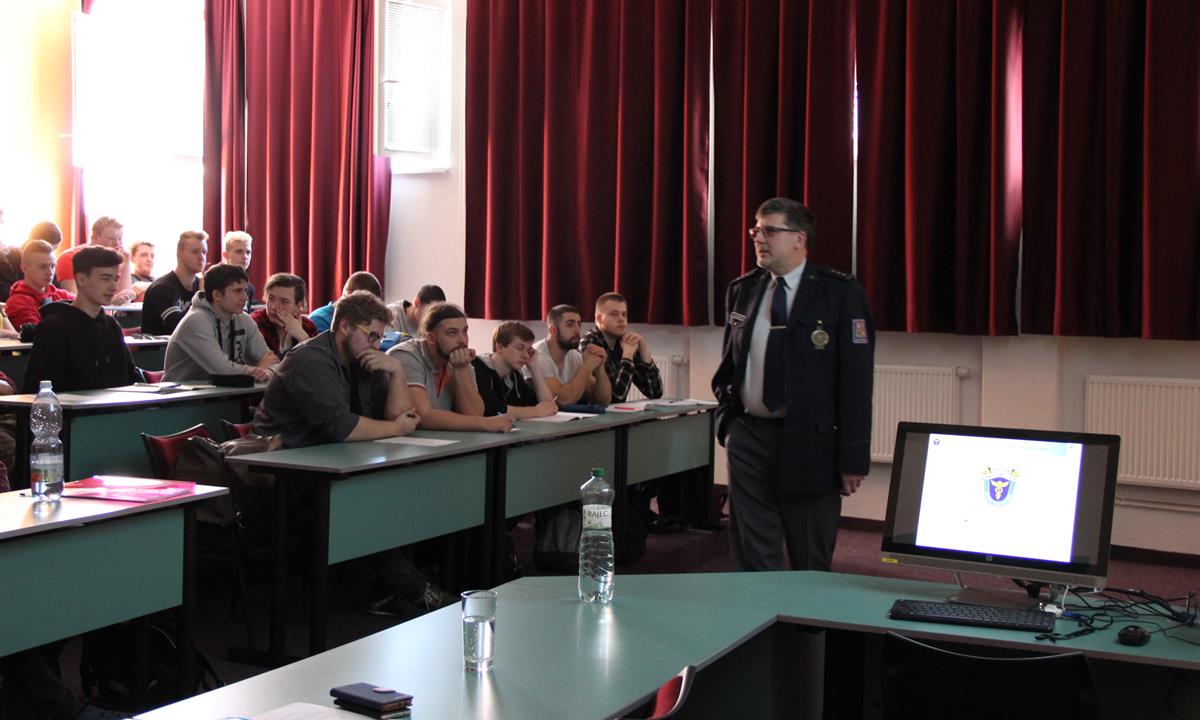 Studenti tří maturitních ročníků zhlédli krátkou prezentaci, která začala stručnou historií celnictví, pár slajdů a slov o organizační struktuře celní správy a seznámili se s některými vykonávanými kompetencemi celníků. Přednáška byla doplněna nejzajímavějšími případy záchytů ať již cigaret, alkoholu, padělků, omamných a psychotropních látek, tak i nelegálně přepravovaných běženců.