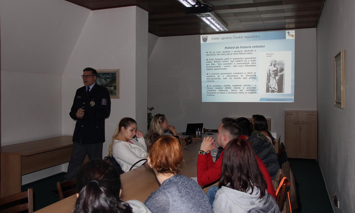 Krátká prezentace představila Celní úřad pro Moravskoslezský kraj, zaznělo pár slov o historii celnictví, o některých vykonávaných kompetencích celní správy a nechyběly ani fotografie a videa ze zajímavých akcí a záchytů ostravských celníků. Studenti se mohli podívat i na ukázky padělaných výrobků a exemplářů CITES.