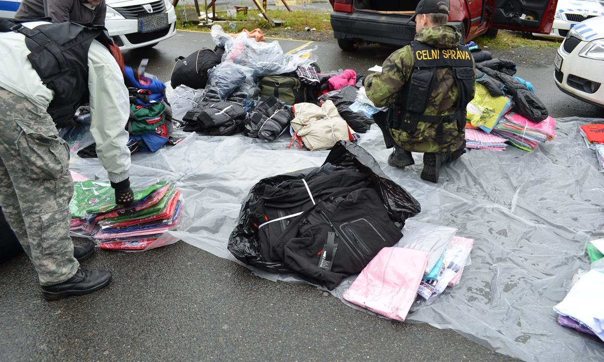 Dva úkryty nelegálního zboží odhalili celníci z Celního úřadu pro Plzeňský kraj na tržnici v obci Svatá Kateřina. Zajistili v nich celkem 2.200 kusů padělků značkového textilu, galanterie, obuvi, hodinek a dalšího spotřebního zboží. Pokud by se jednalo o originální zboží, přesahovala by jeho cena 5 miliónů korun. Oba úkryty celníci odhalili při prohlídkách jiných prostor a pozemků, ke kterým vydal příkaz soudce Okresního soudu v Tachově.