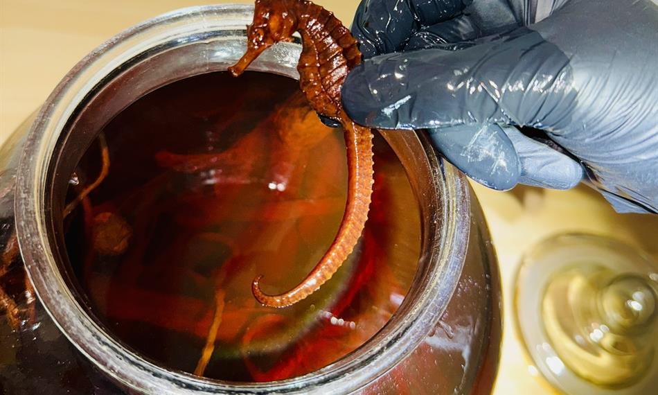 Kontrola se zaměřením na prodej a skladování vybraných výrobků proběhla v uplynulém týdnu v prodejně potravin v Rokycanech, kde ve skladovém prostoru provozovny celníci nalezli dvě skleněné čiré lahve s neznámou tekutinou tmavě hnědé barvy zapáchající po lihu. Tyto lahve nebyly opatřeny žádným označením, etiketou ani kontrolní páskou. Při vizuální kontrole bylo zjištěno, že jedna z lahví obsahuje předměty živočišného a rostlinného původu, mimo jiné i mořské koníky, které chrání úmluva CITES (Úmluva o mezinárodním obchodu s ohroženými druhy volně žijících živočichů a planě rostoucích rostlin).