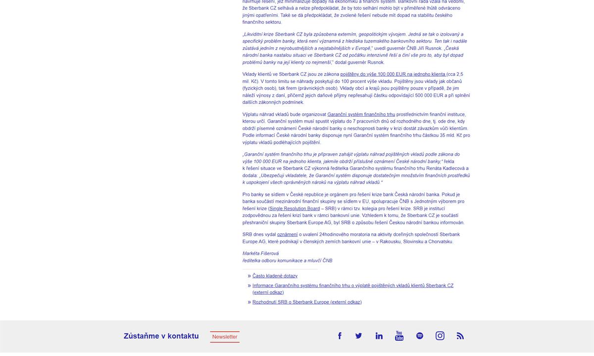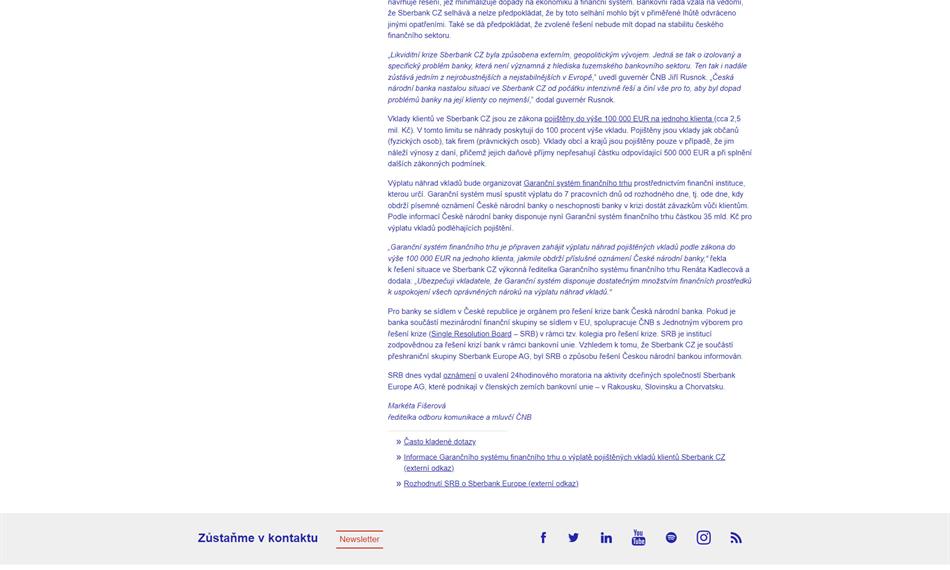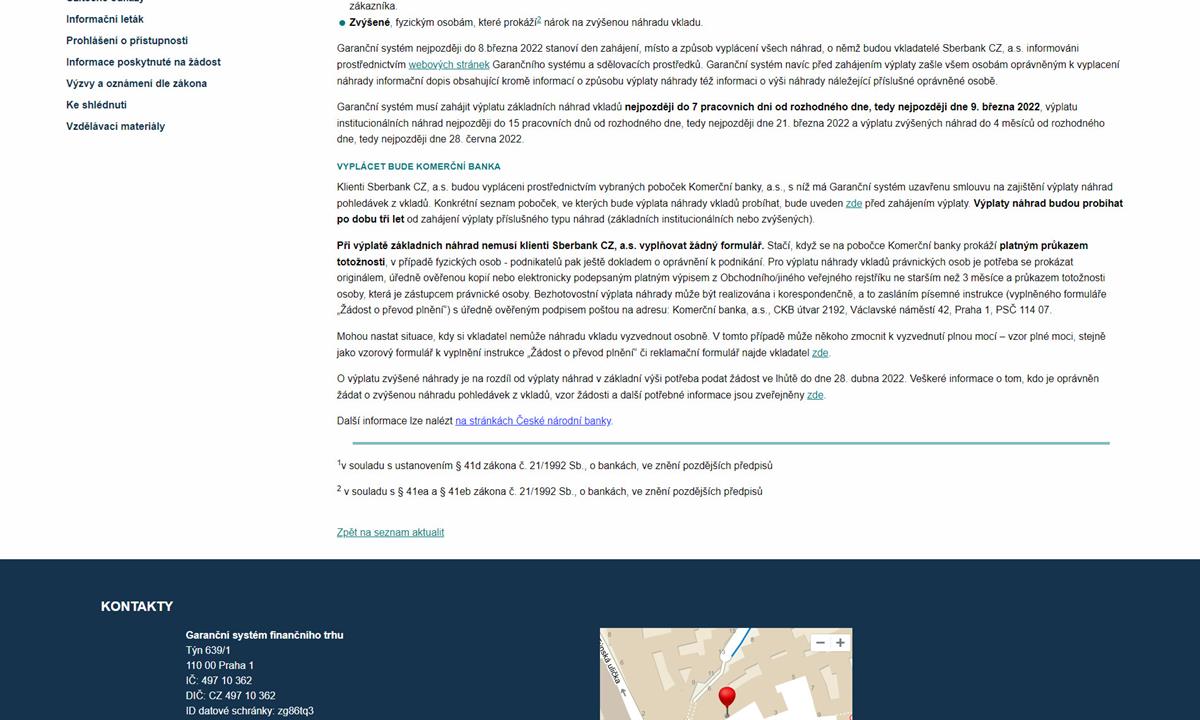 Na základě Oznámení České národní banky o neschopnosti Sberbank CZ, a.s. dostát závazkům vůči oprávněným osobám za zákonných a smluvních podmínek nebude již nadále Celní správa České republiky v souladu s čl. 94 odst. 3 nařízení Evropského parlamentu a Rady (EU) č. 952/2013, kterým se stanoví celní kodex Unie (dále jen „UCC“), přijímat souborné jistoty, které jsou zajištěny závazkem ručitele Sberbank CZ, a.s., jelikož není možné zaručit, že částka dovozního cla odpovídající celnímu dluhu a jiné poplatky budou ve stanovené lhůtě uhrazeny. Bude-li takováto souborná jistota předložena při celním řízení, bude aplikován čl. 97 UCC.