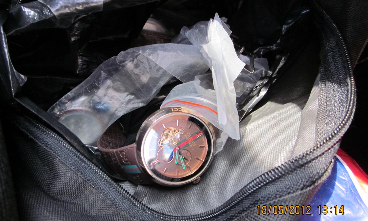 Ve vozidle celníci zajistili celkem 129 kusů hodinek (Rolex, Breitling, Omega), 118 kabelek (Louis Vuitton, Burberry, 22 párů bot a 112 kusů oděvních doplňků (Gucci, Prada, Chanel). Prodejní hodnota originálů by činila přibližně 10 327 000 korun.