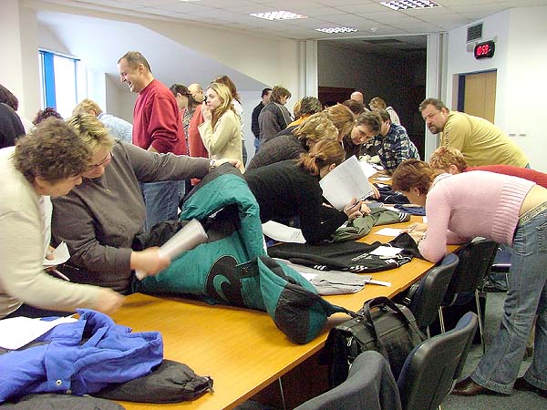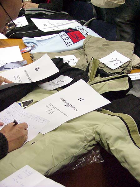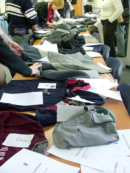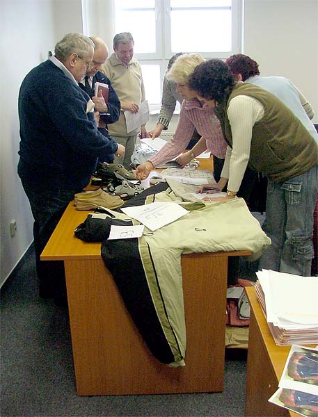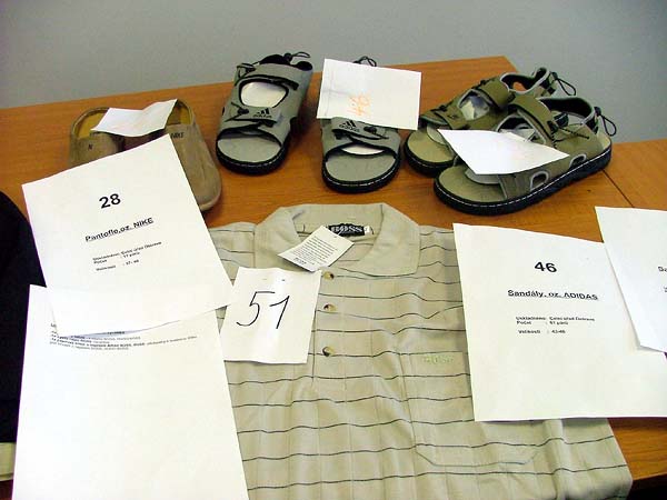 Stoly velké zasedací místnosti zaplnilo na pětapadesát rozmanitých druhů většinou zimního oblečení a několik typů obuvi, nesoucích více či méně zdařilé falzifikáty nejznámějších markantů renomovaných výrobců. Každý vzor byl označen pořadovým číslem a názvem, doplněn seznamem sortimentu velikostí a množstvím nabízených kusů a popisem úprav, které je třeba provést, aby se z padělku značkového zboží stal naprosto neutrální výrobek navíc označený nápisem „humanita“.