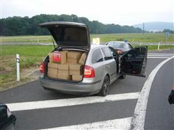V úterý 20. července zastavili olomoučtí celníci vytipované osobní vozidlo Škoda Octavia combi. Řidič auta s českou státní poznávací značkou tvrdil, že veze žvýkačky a cigarety. Celníci zkontrolovali vnitřní prostor vozidla a na zadních sedadlech i v zavazadlovém prostoru našli 120 tisíc kusů cigaret značky MG premium blend bez kolku.