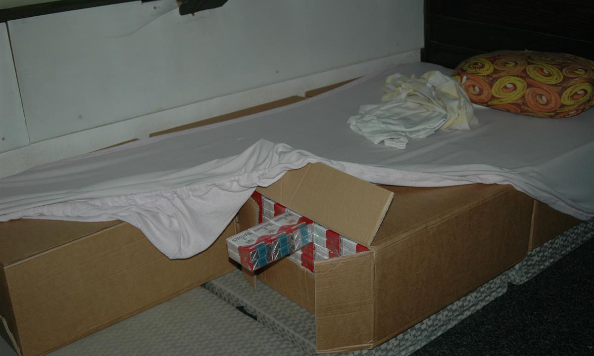 Pod podlahou a v krabicích místo matrace v posteli objevili při domovní prohlídce provozovny celkem 128.800 kusů (6.440 krabiček) nezdaněných cigaret převážně pocházejících z Ukrajiny. Jednalo o značky Classic, LM a Marlboro.