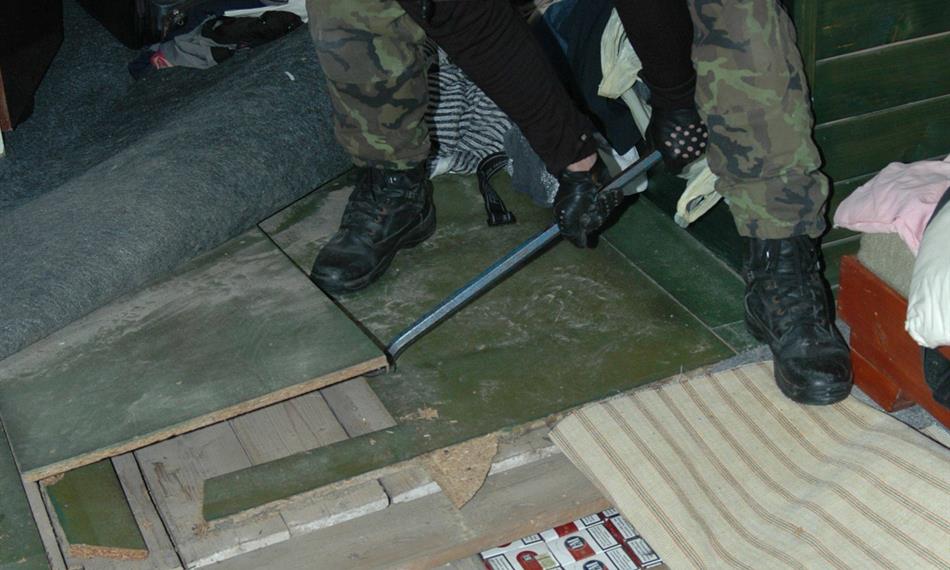 Úkryt pod podlahou byl pro skladování cigaret speciálně vybudován. Podlaha o rozměrech 2x3 metry byla vyvýšena asi o 30 cm, a vznikl tak prostor pro ukrytí značného množství zboží. Po celé ploše byly rozloženy kartony cigaret.
