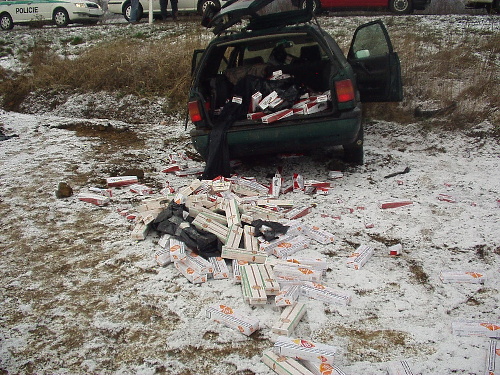 Havaroval tu osobní automobil zn. VW Passat variant, jehož osádka vůz opustila ještě před příjezdem kontrolních orgánů. Není divu. V nákladovém prostoru havarovaného vozu se nacházelo 450 kartonů cigaret různých značek (Marlboro, Golden American, F6, West, HB). Krabičky cigaret postrádaly tabákové nálepky platné na území ČR. Celníci devadesát tisíc kusů neznačených cigaret v hodnotě téměř 310 tisíc korun převezli do celního skladu. Stát by jejich prodejem přišel na daních o bezmála 206 tisíc korun.