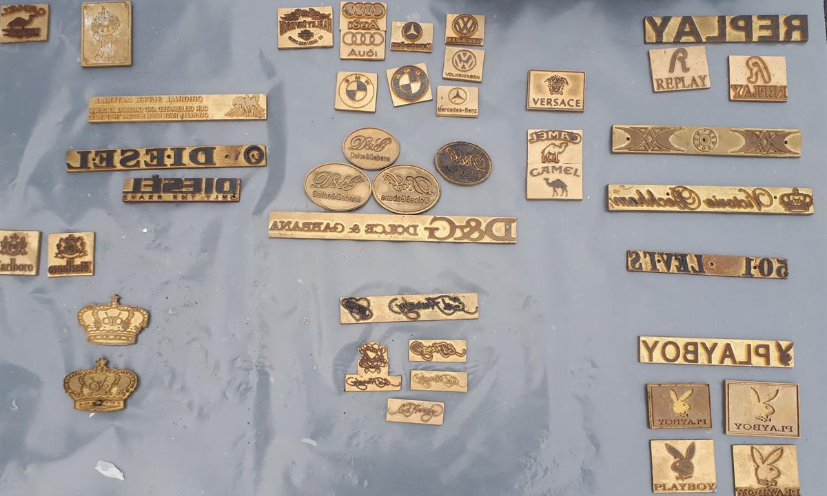 log ochranných známek a 63 kusů kovových matric s logy ochranných známek