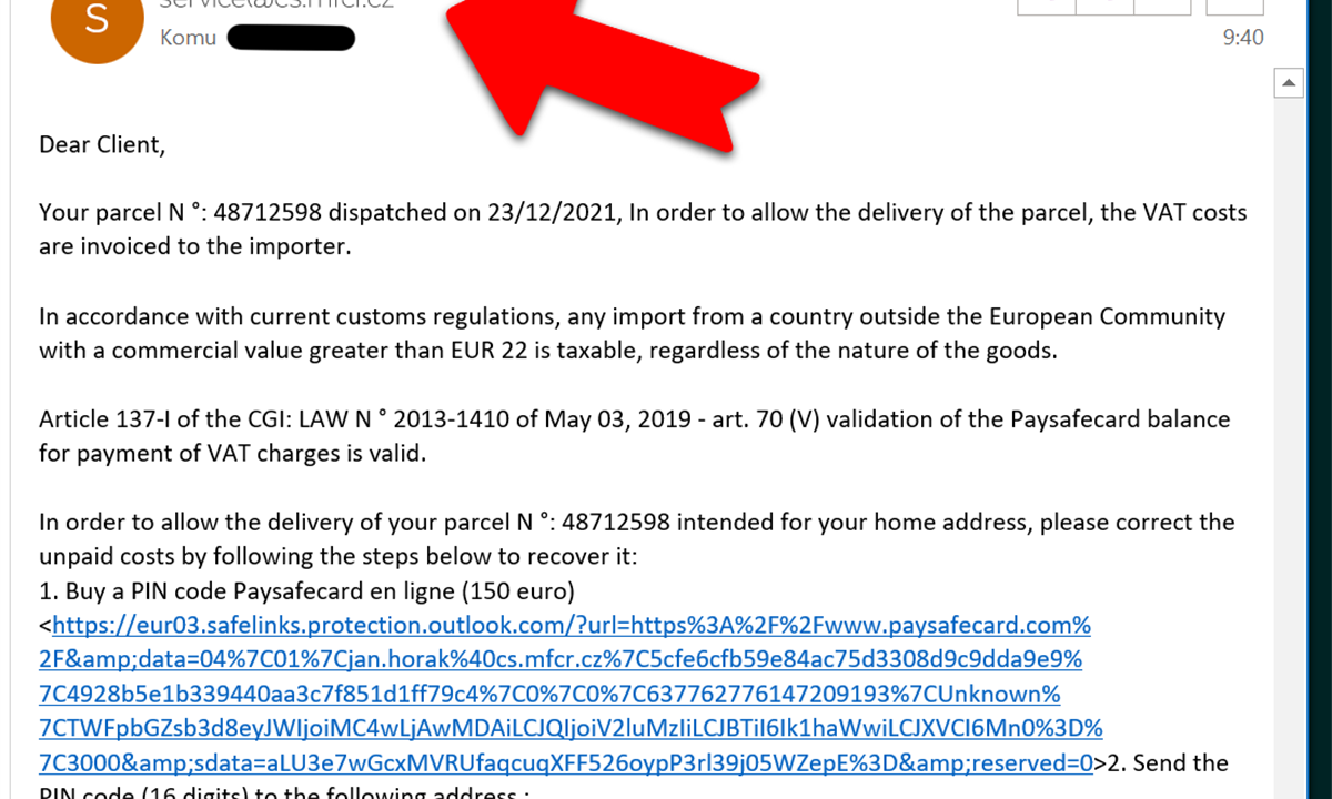 objevují případy nevyžádaných e-mailů z adresy service@cs.mfcr.cz, kdy je u objednaného zboží s hodnotou vyšší než 22 EUR požadován